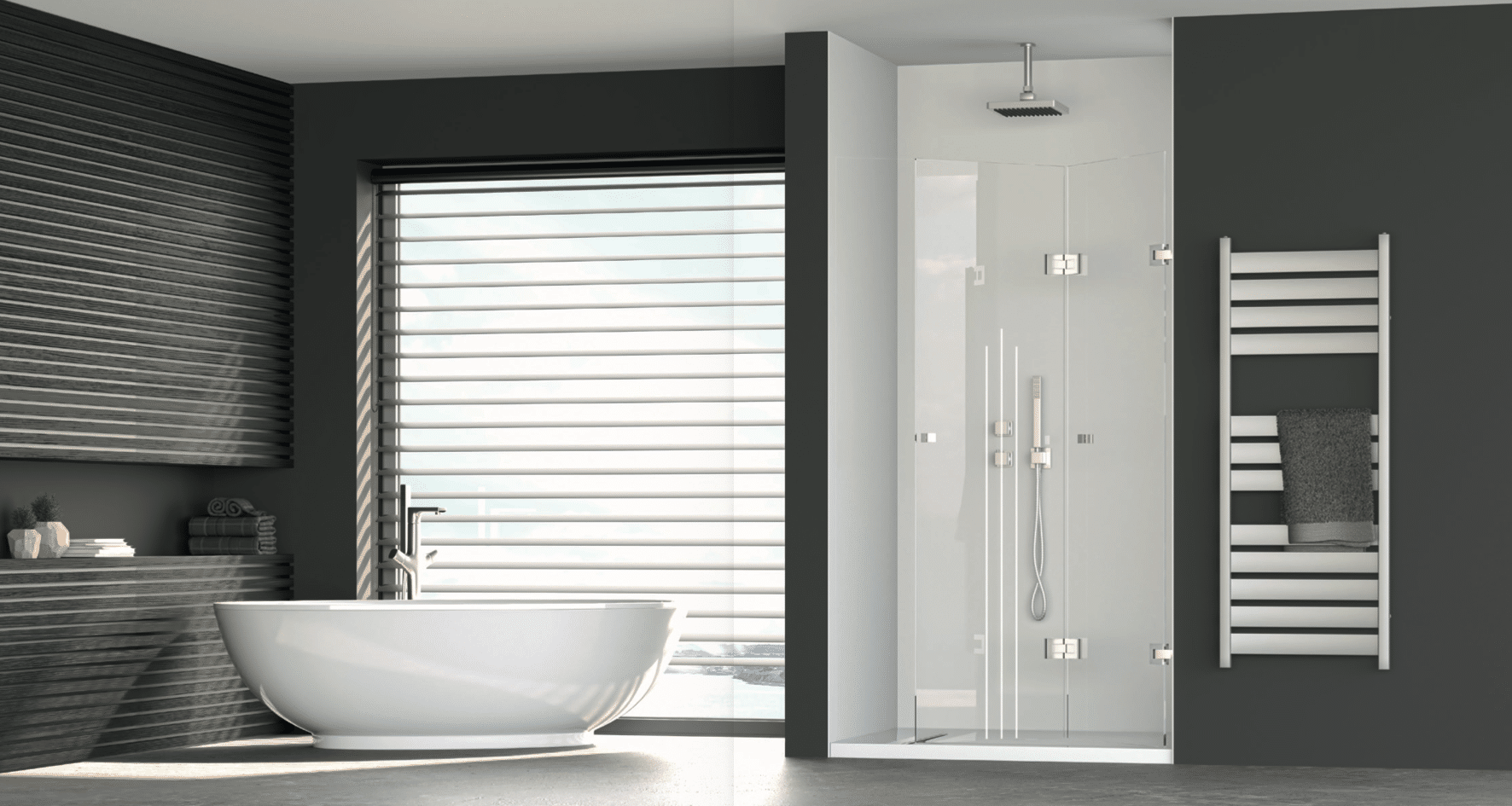 Drehtür für schmale Nischen Maßgefertigte Nischendusche mit nach innen und außen öffnender Pendeltür. Ideal, wenn wenig Platz vorhanden ist – die Tür lässt sich komplett an die Wand klappen und gibt den gesamten Einstieg frei.