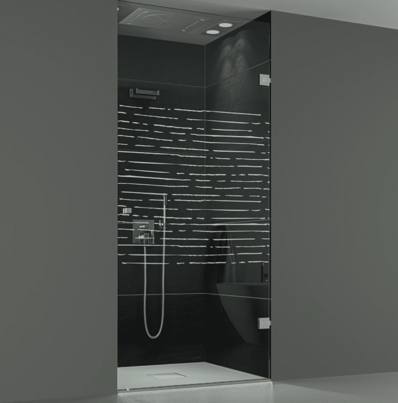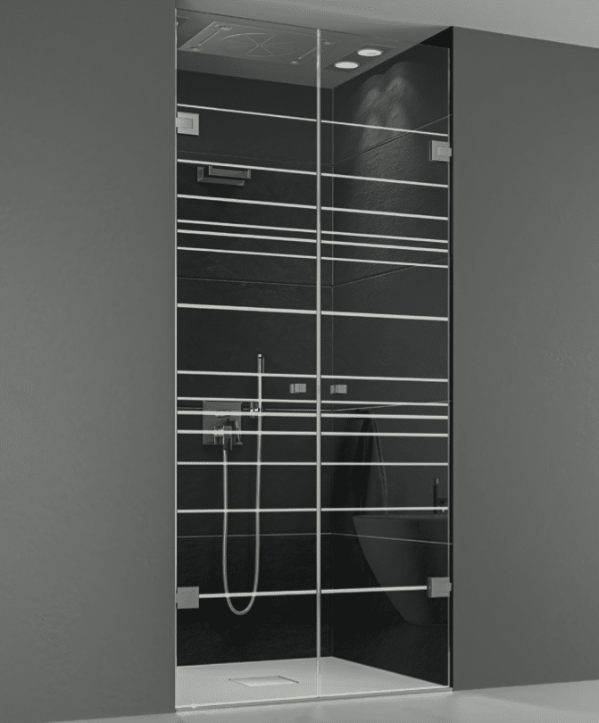 Klare Linien, ruhiges Design Vollglastür mit dezenten Dekorstreifen als Sichtschutz. Die teilsatinierte Oberfläche sorgt für Privatsphäre im Duschbereich, ohne dem Raum Licht oder Weite zu nehmen – eine elegante Lösung für offene Badgrundrisse.