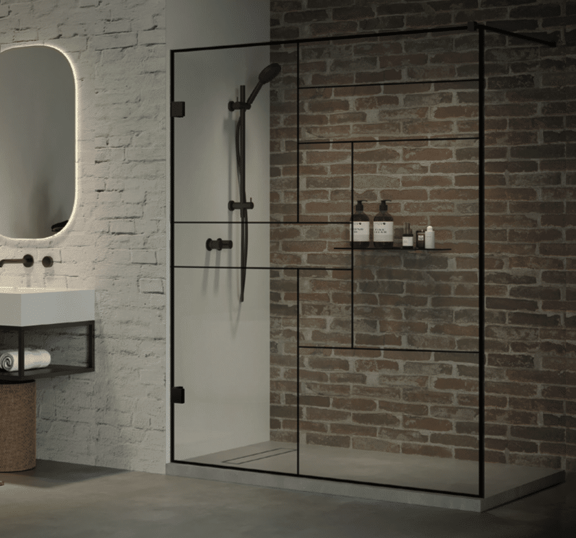 Designglas mit individuellem Dekor Glasdusche mit schwarzen Beschlägen und geometrischem Muster auf dem Glas – ein Blickfang, der zeigt, wie sich Funktion und persönlicher Stil verbinden lassen. Schwarze Beschläge setzen klare Akzente im hellen Bad.
